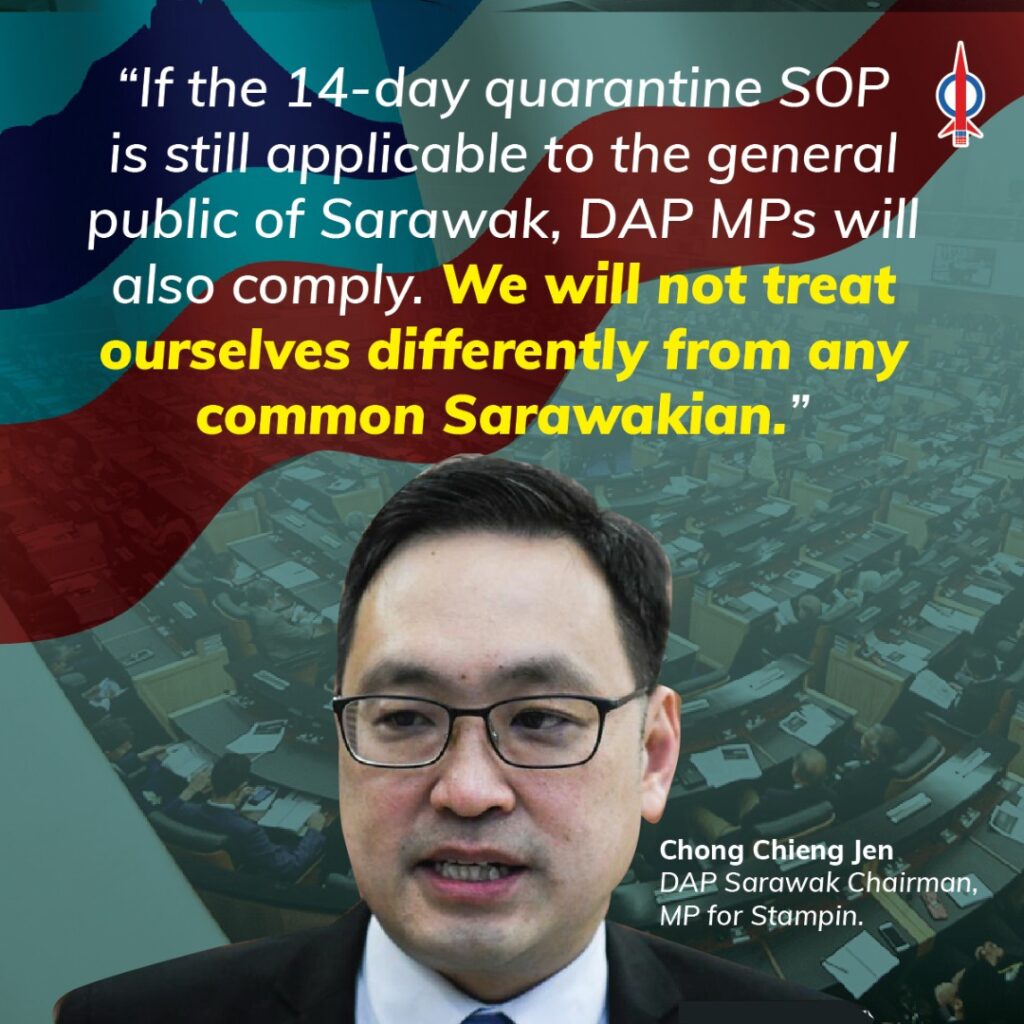 At the end of the session, if the 14-day quarantine SOP is still applicable to the general public of Sarawak, the DAP MPs will also comply with such quarantine SOP till the 14-day quarantine period. We will not treat ourselves differently from any common Sarawakian.