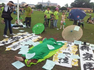 Various groups conducted different activities in other parts of the MPK4 field. Save Jalan Sultan Group staged a live exhibit with a mock dead body and warning signs protesting against the Lynas plant.