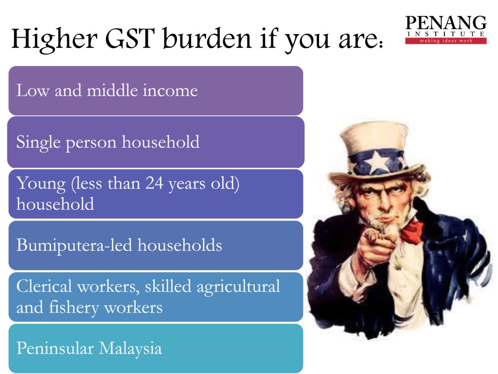 The paper titled “GST is a regressive tax” written by Penang Institute fellow Dr. Lim Kim Hwa and Research Analyst Ooi Pei Qi also found that GST will have a regressive effect with lower income households bearing a higher tax burden than higher income households. The research paper is made available to the public here: http://www.penanginstitute.org/gst/