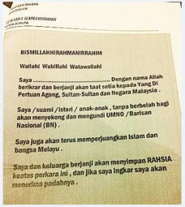 The oath script written in malay reads, ““I will also continue to defend Islam and Malays. My family and I promise to keep this matter secret, or face the consequences.”