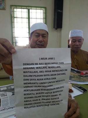 “I hereby solemnly swear and promise, in the name of Allah, that I will vote BN in the coming election, and that I will work to help UMNO to unite Muslims under the United Malays National Organisation, not to disunite Muslims, unlike Hj. Abdul Hadi Awang who wants Muslims and Malays in Malaysia to be destroyed and fall apart.”
