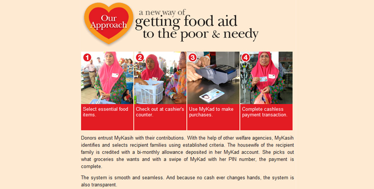 My Kasih is funded by corporate sponsors and gives poor households credit points in the recipient’s MyKad, which can be swiped to purchase groceries without the need for cash to change hands. The program which lasts for a year, imposes certain conditions on the recipients including: children of the household must attend school and the family must go through Bank Negara financial literacy training. (details at www.mykasih.com.my)