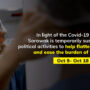 In light of the huge surge in Covid-19 cases for the third wave of the pandemic, DAP Sarawak shall suspend all political activities involving human contact with effect from 9-10-2020 till 18-10-2020.