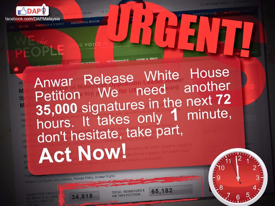 “Anwar Release White House Petition – We need another 35,000 signatures in the next 72 hours. It takes only 1 minute, don’t hesitate, take part, Act Now!” read one of the posts on Serdang MP Ong Kian Ming’s Facebook Page.