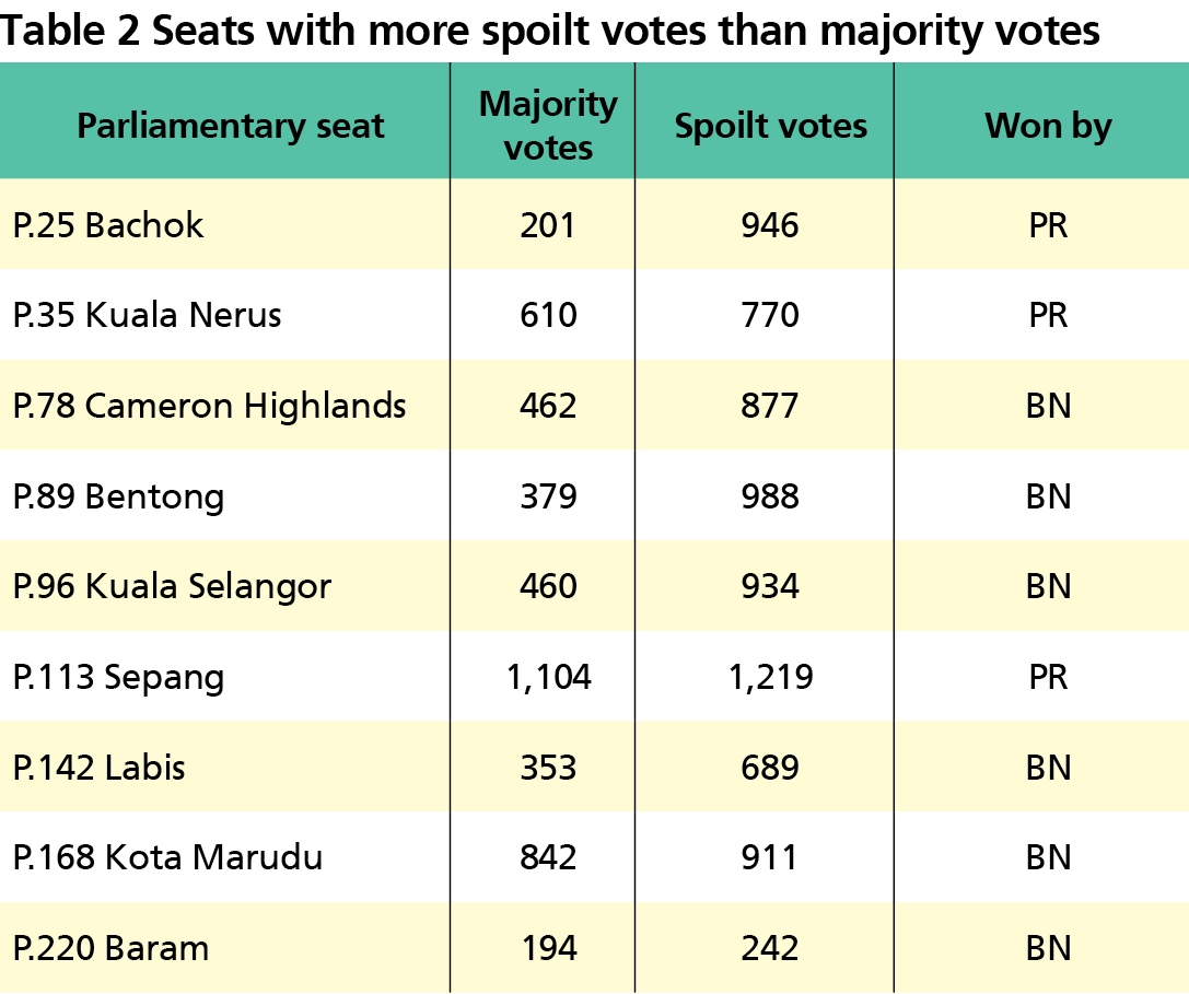 At the same time, there were nine seats with more spoilt votes than the majority vote margin (BN 6, PR 3) (refer Table 2).