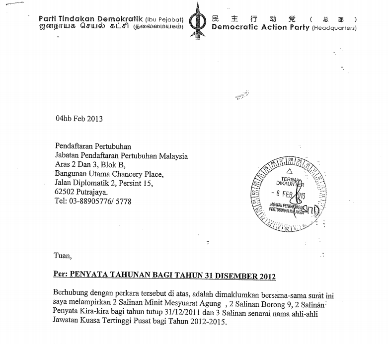 The documents submitted by the DAP to ROS were two copies of the minutes of the Annual General Meeting, two copies fo Form 9, two copies of the party accounts for the year ending 31 December 2011 and three copies of the Central Executive Committee (CEC) name list for the 2012 – 2015 term.