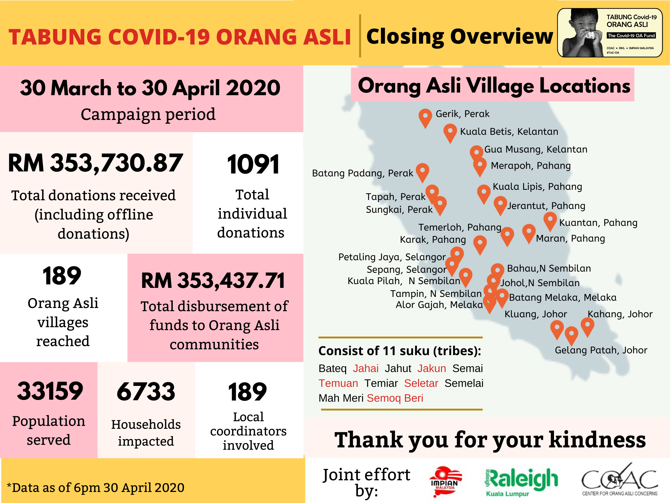 Thanks to your generosity, the Tabung Covid-19 Orang Asli Fund successfully raised RM353,730.87 as at 30 April 2020.