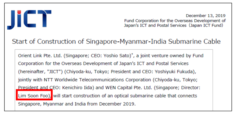 As stated earlier, Mr Yoshiao Sato is the CEO of Orient Link Pte Ltd which is a Singapore registered company. In Orient Link’s website, it is described as “a strategic joint venture company led by NTT Group and established with partners of Fund Corporation for the Overseas Development of Japan’s ICT and Postal Services Inc. (JICT) and WEN Capital Pte. Ltd. (WEN)”. [9] In a press statement by the Japan ICT Fund or JICT dated December 13, 2019[10], it was stated that the Director of Wen Capital is none other than Mr Lim Soon Foo.