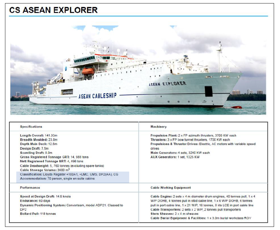 Technical Specifications of Asean Explorer, which is owned by ASEAN Cableship, where Telekom Malaysia (TM) is a 16.7% shareholder, showing that it has DP2 capabilities