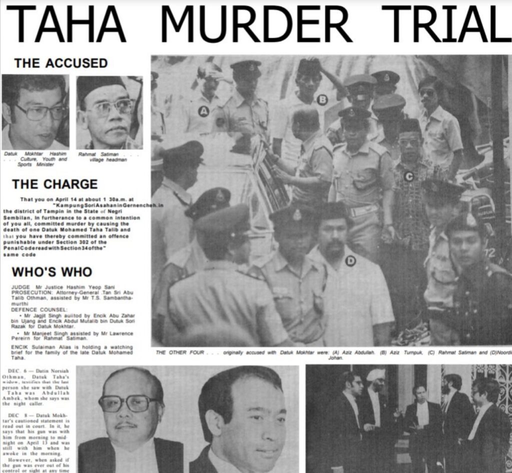 An interesting example would be how the Government handled the case of a Culture, Youth and Sports Minister also Member of Parliament for Tampin Datuk Mokhtar Hashim who shot his political rival, the Speaker of the State Assembly in Negeri Sembilan Datuk Mohamad Taha Talib in 1982, as they were both from the same political party, UMNO. On April 14, 2 shots were fired, and the Speaker was killed outside his own house. Mokhtar Hashim then was seen at the funeral of the man he shot and subsequently was arrested and charged for murder alongside 3 other men. In Malaysia the punishment for murder (Sec 302 of the Penal Code) is the mandatory death penalty. If found guilty for murder, then punishment if the mandatory death penalty. Apart from that a discharge from a firearm also warrants the mandatory death penalty, both of which witnesses said Mokhtar was guilty of. Mokhtar Hashim was sentenced to death, and then commuted to life imprisonment and in 1991 was pardoned by the King and released – less than 10 years after the killing of Taha Talib.