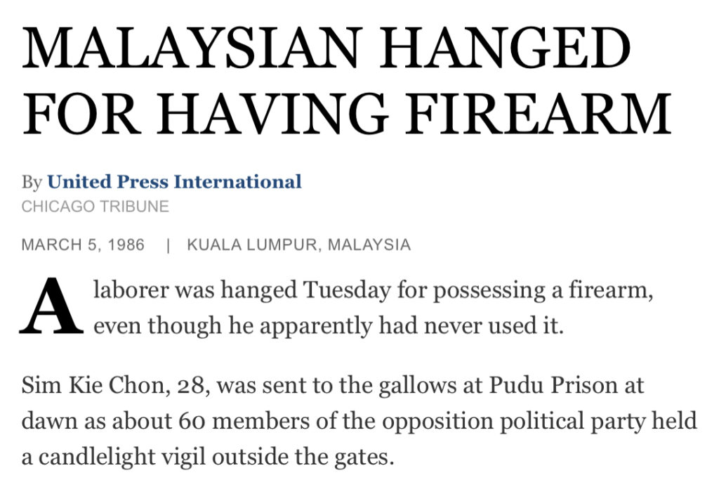 In shocking stark contrast, in December 1981 a poor labourer Sim Kie Chon, 28, was detained under the Internal Security Act (1960) for the unlawful possession of a firearm. He was sentenced to death in June 1983. The ISA was an archaic tyrannical law where detainees undergo “detention without trial” for years and years because they are considered “a threat to national security” . And a possession of firearm could face the mandatory death penalty. Sim Kie Chon never used the gun, never discharged it but was sentenced to death. The DAP organised a nationwide signature campaign in 1985, and at that time even PAS was also involved in appealing to the Government to review his death sentence and pressed on instead for life imprisonment. An appeal was made for a royal pardon and for clemency to commute his sentence. His appeal was rejected and he was executed on August 15 1985.