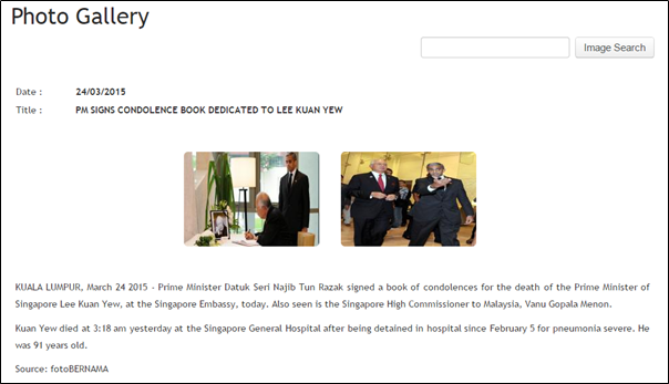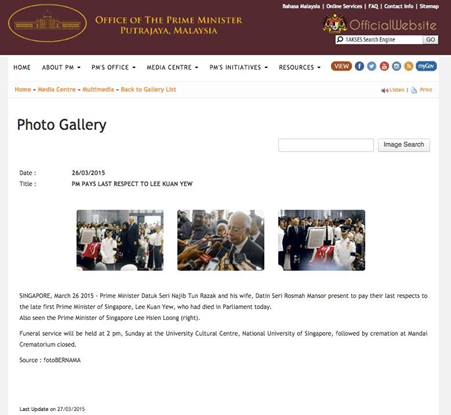 A screenshot taken of the website described Prime Minister Najib Razak and his wife paying their last respects to the late Singapore Premier Lee Kuan Yew, the text read:
