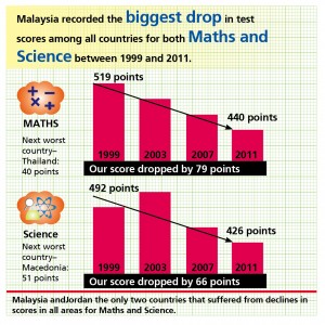 In the four TIMSS 1999-2011, Malaysia is the country which suffered the biggest drop in scores among all participating countries for both maths and science : in maths dropping by 79 points from 519 in 1999 to 440 in 2011; in science, dropping by 66 points from 492 in 1999 to 426 points in 2011.
