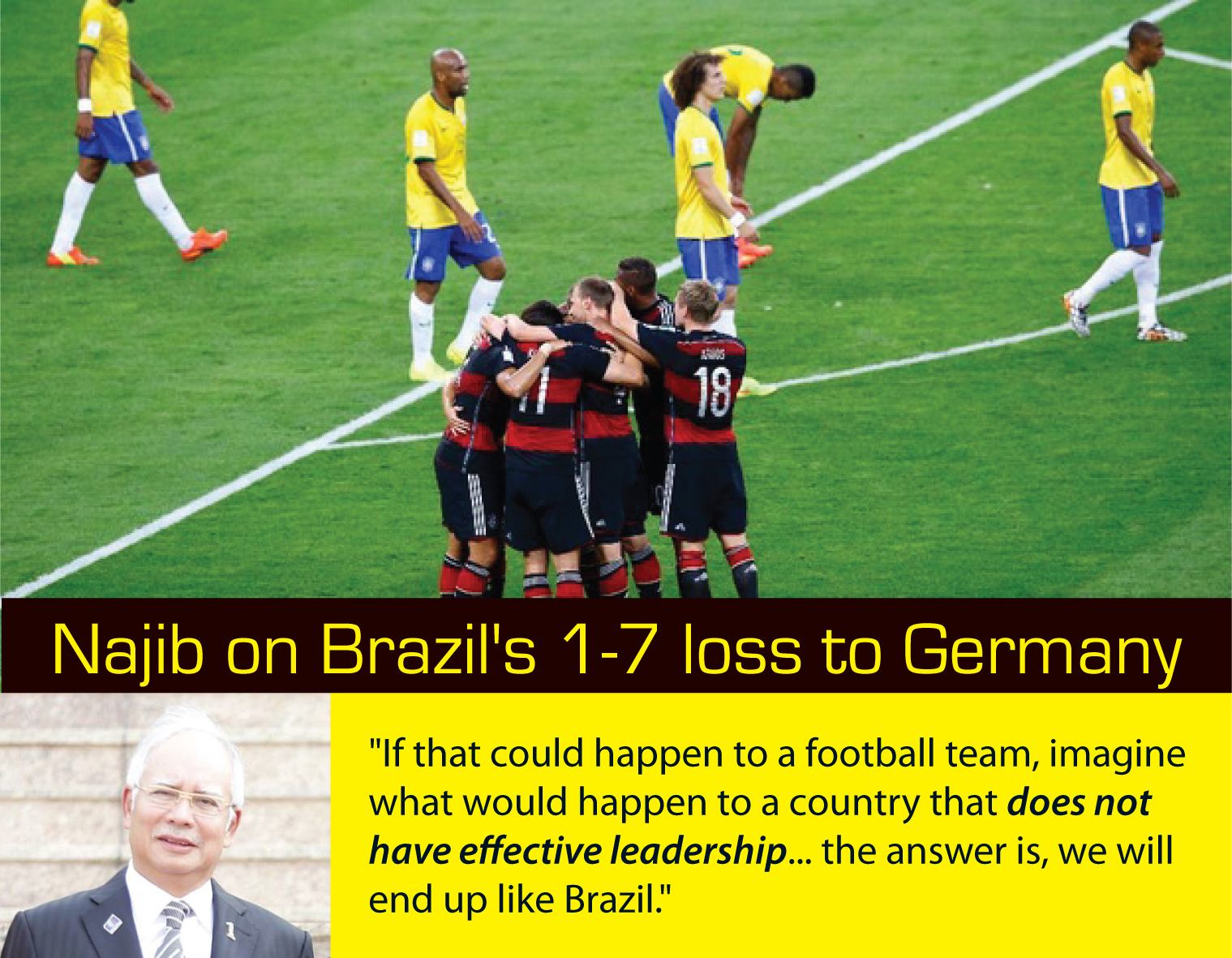 It is both ironic and tragic that the Prime Minister, Najib Razak could point to Brazil’s 1-7 massacre by Germany in the World Cup as the fate of absence of leadership when he himself has set Malaysia on auto-pilot without any leadership from him in the past year.