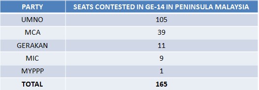 In the 14th General Election, of the 165 parliamentary seats in the Peninsula, Umno contested 105 seats, MCA 39, Gerakan 11 and MIC 9 and MyPPP 1.