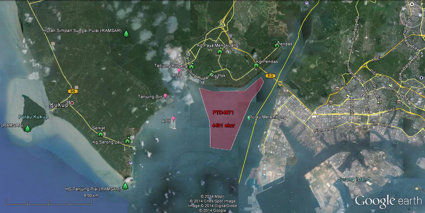 One example of this ‘crazy’ project is now being carried out in the waters of Tanjung Kupang, located in the Straits of Johor. Gelang Patah MP Lim Kit Siang has named it as ‘Ubah Island’. The size of the project area is approximately two thousand five hundred acres. It is located about 10 km from the Singapore coastline. On the map, this area shows that it is located within the Iskandar Development Region (IRDA).