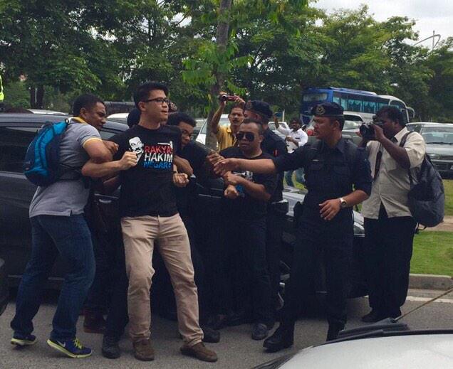 3:45pm PKR State Assemblyman for Simpang Pulai, Tan Kar Hing has been detained by police at the Palace of Justice and is now being brought to IPD Putrajaya. He was alleged to have obstructed the police vehicle carrying Anwar from leaving the court complex. A team of lawyers from Suaram are with him.