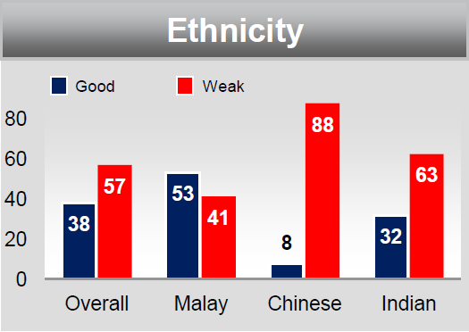 When the question “how much do you understand how the national economy works?” was asked, a higher percentage of Indians answered “a great deal” or “a fair amount”, as compared to Chinese or Malays. This was also true for government and GLC employees, who far outnumber the percentage represented by private sector workers in this respect.