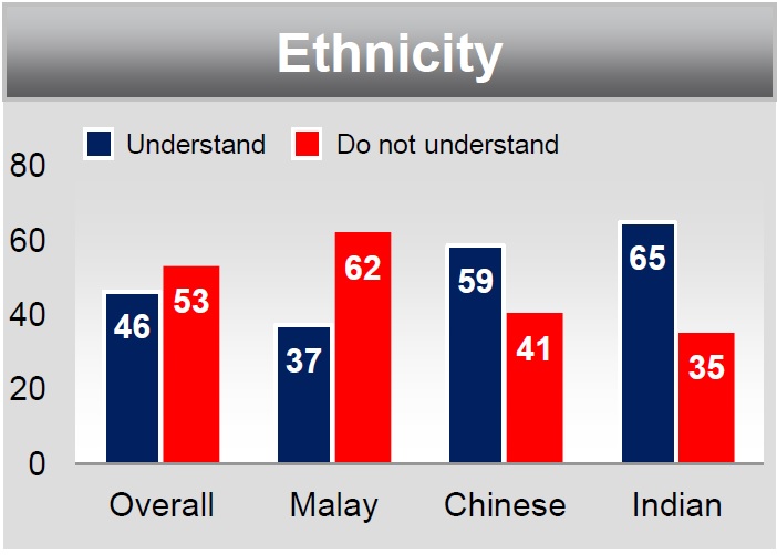 In terms of understanding of GST based on ethnicity, Indians recorded the highest numbers at 65 percent, followed by Chinese at 59 percent and Malays at 37 percent. Also, those who follow alternative media appear to understand the tax better than mainstream media readers.