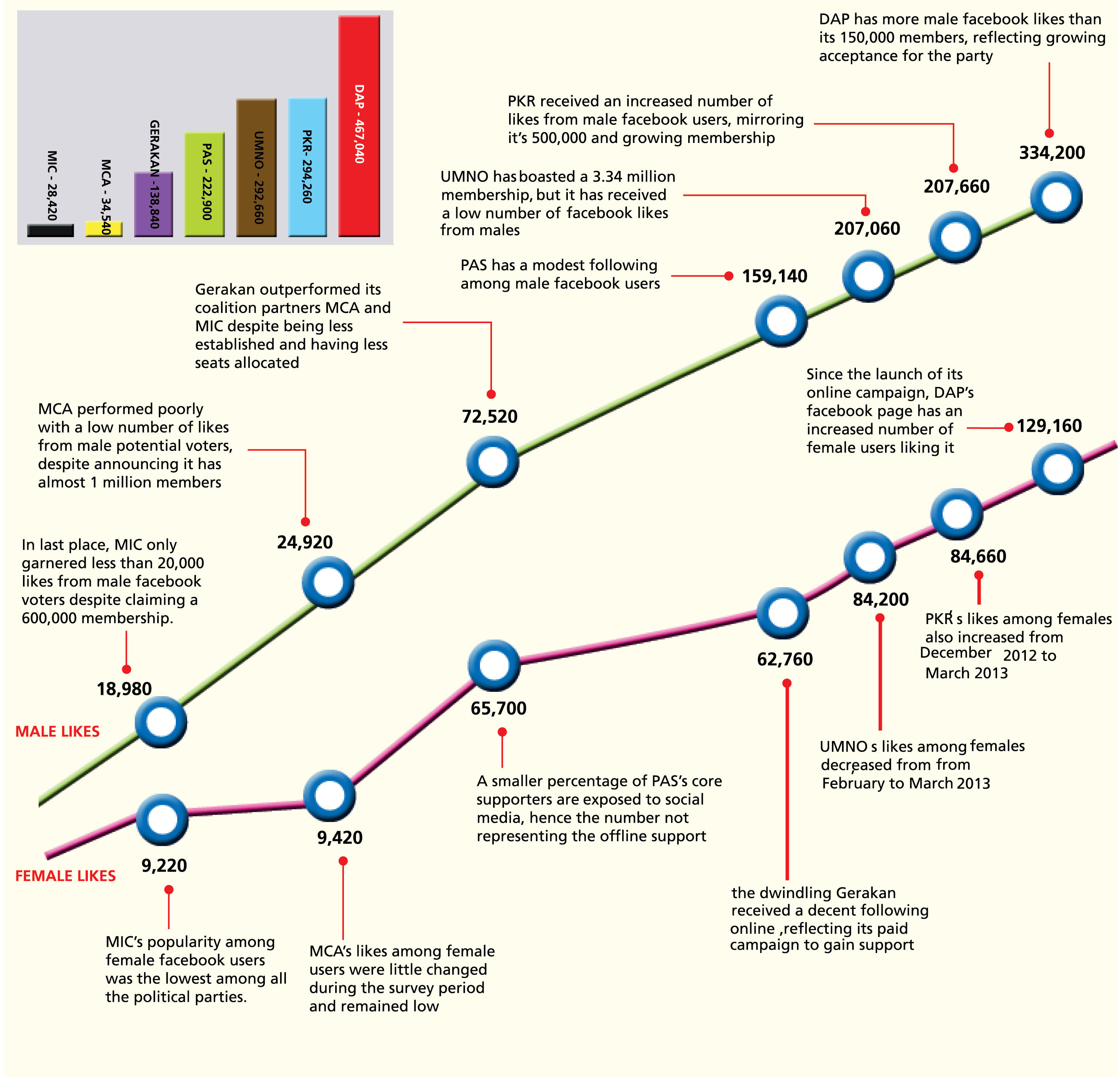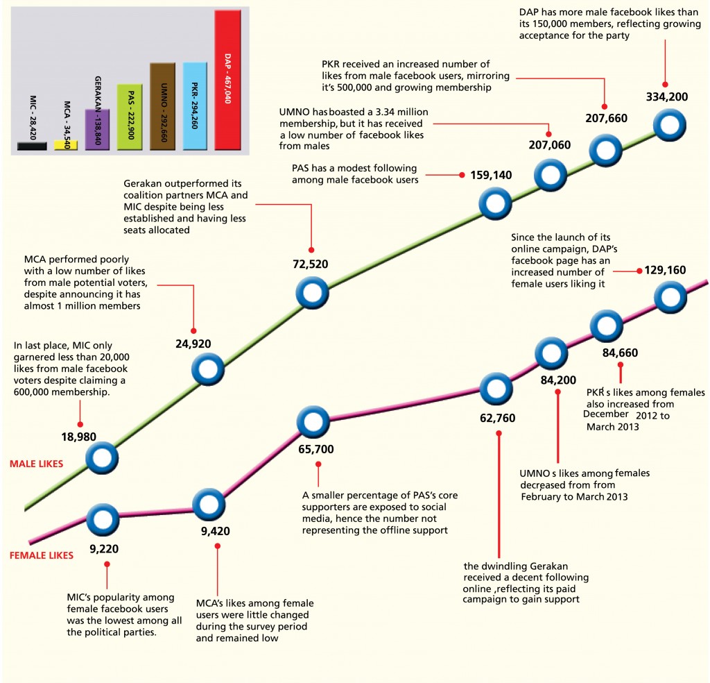 According to the survey conducted by PoliTweet.org, DAP was leading the cyberspace charge with 467,040 likes as of March 2013. This was followed by PKR at 84,660 likes and UMNO at 292,260 likes respectively.