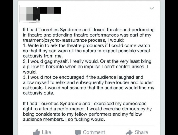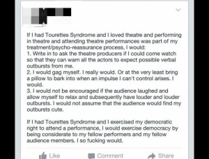 Her long diatribe included suggesting that those suffering from Tourette’s to “ask permission from theatre producers before attending a show” or “gag” themselves, or at the least “bring a pillow to bark into”.
