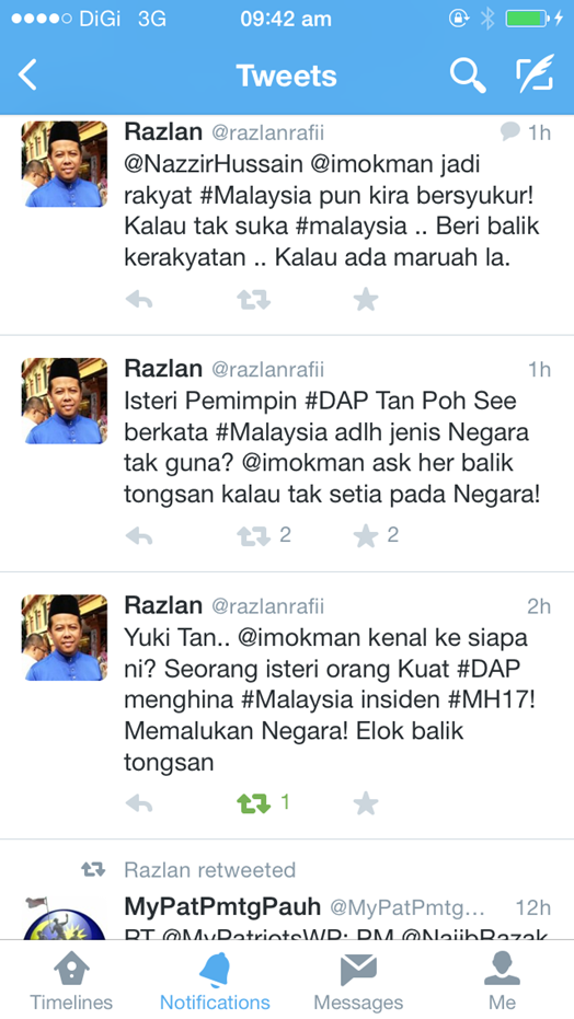 twitter umnoThe UMNO Federal Territory Youth Chief racist rant on Twitter is indicative of “trying to be a hero” , said Serdang MP Ong Kian Ming today. The former, Razlan Rafii, had tweetedIsteri Pemimpin #DAP Tan Poh See berkata #Malaysia adlh jenis Negara tak guna? @imokman ask her balik tongsan kalau tak setia pada Negara!”. He referenced Tan Poh See’s [Tanjung MP Ng Wei Aik’s  wife] post on Facebook that said “Malaysia is a scary nation, what kind of useless country is this?” after the MH17 crash. She had later removed the post and apologized on social media.