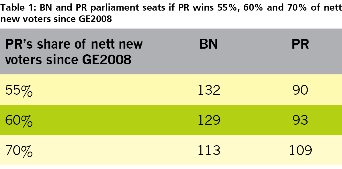 It is not sufficient for Pakatan Rakyat to win over the majority of the 3 million new voters to reach Putrajaya. Assuming that the % of votes won by BN and PR among the GE2008 voters remain the same, even if PR wins 70% of the nett new voters, PR can only win 109 parliamentary seats out of 222 parliament seats (Table 1 below)