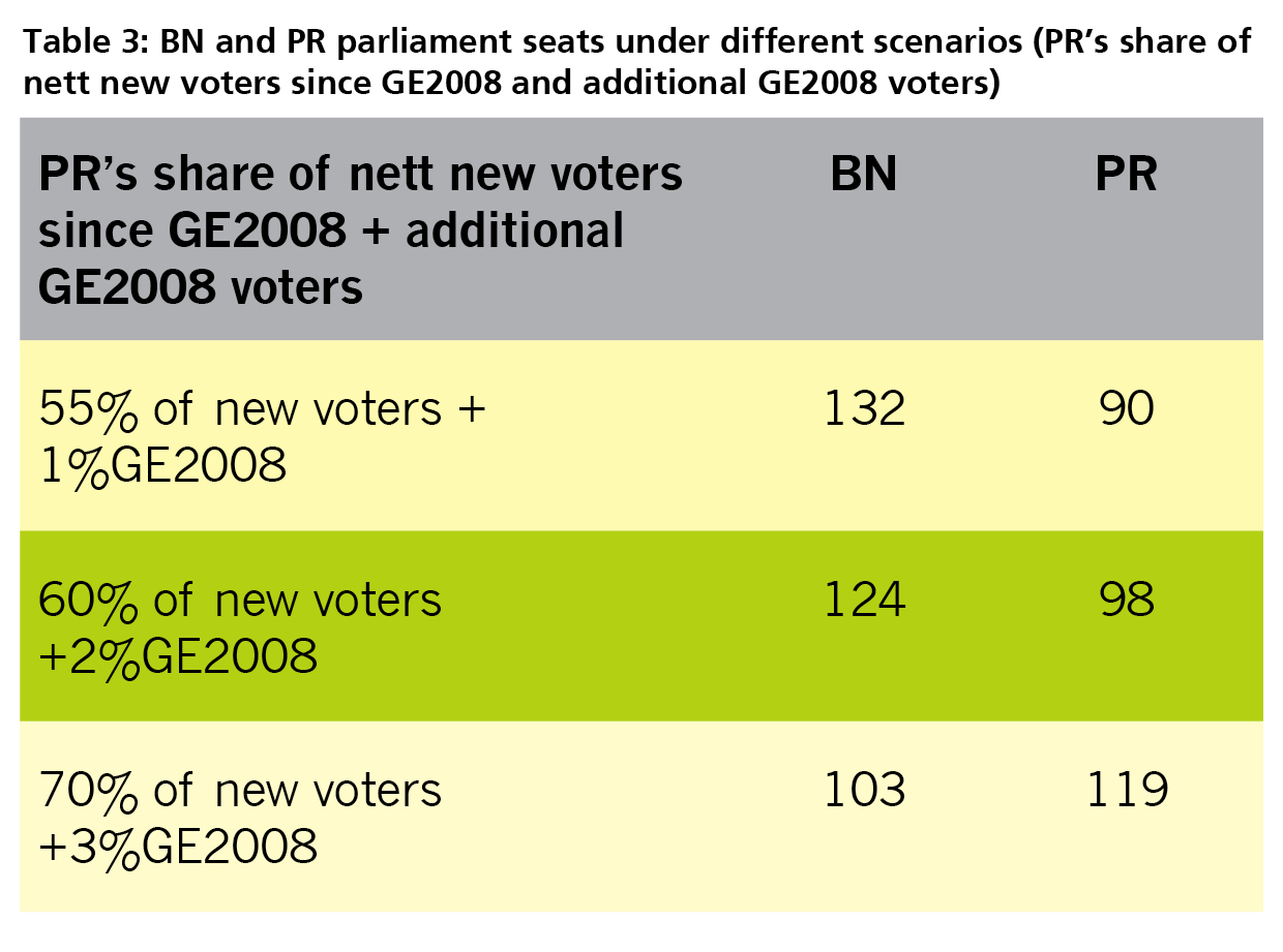 To get to Putrajaya, PR must also convince a larger % of the GE2008 voters to switch their vote to PR. Only if PR manages to win 70% of nett new voters since GE2008 and an additional 3% of GE2008 voters can PR reach Putrajaya with a somewhat comfortable majority of 7 parliament seats (119) (See Table 3 below)